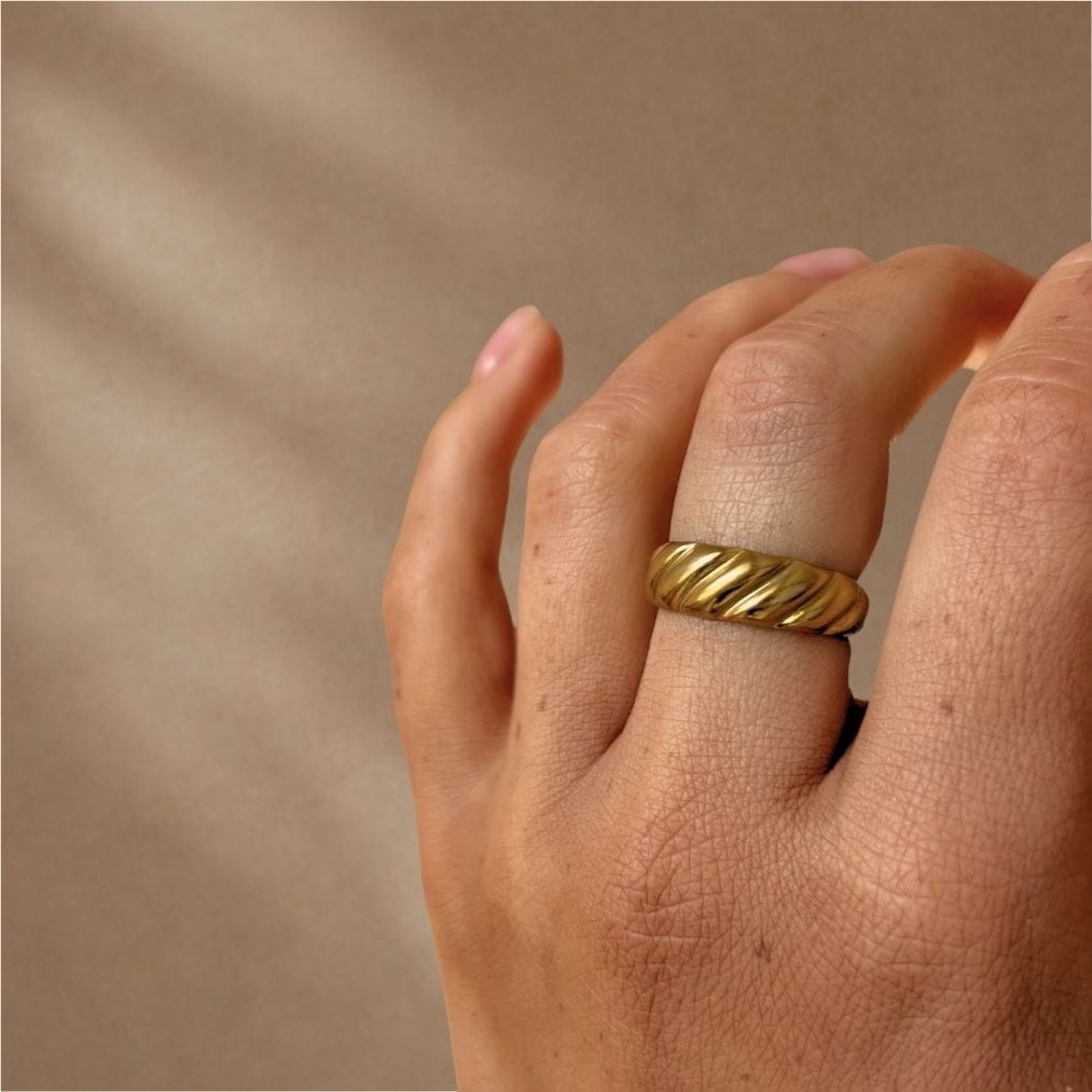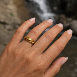 Wykonany z trwałej stali szlachetnej, pierścionek o złotym kolorze jest zarówno piękny, jak i odporny na codzienne zużycie.