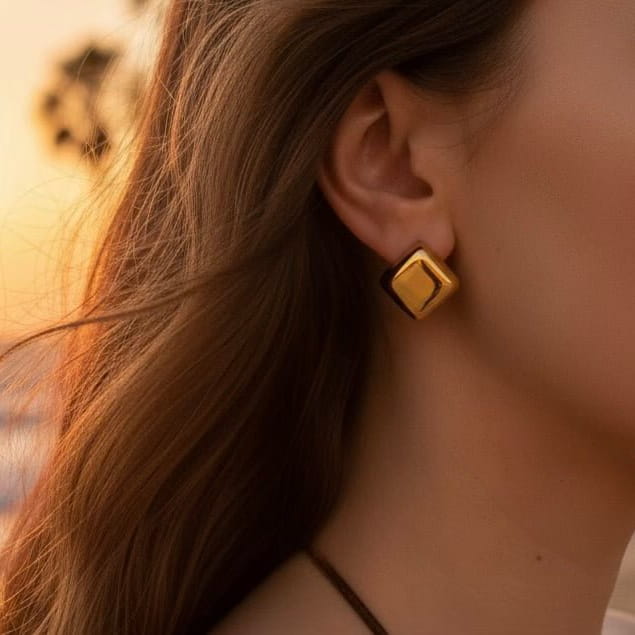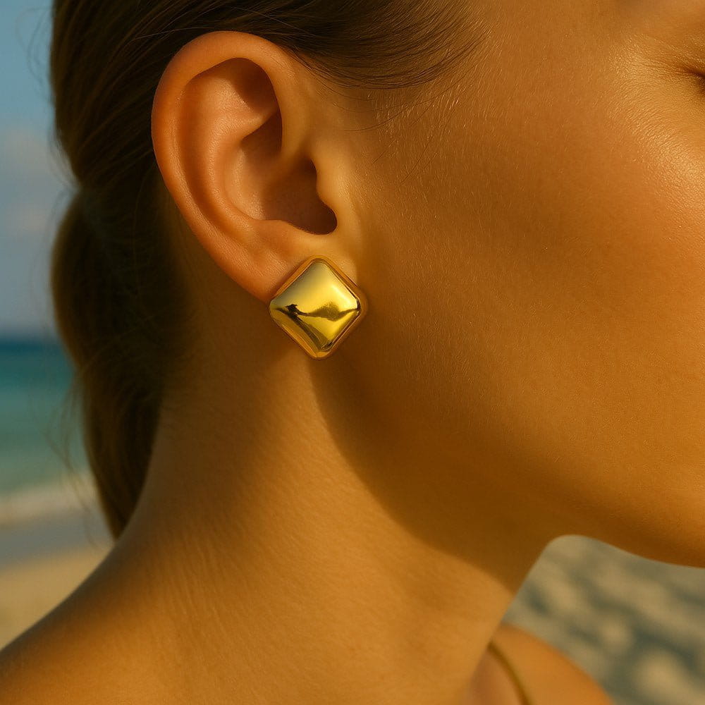 Kolczyki Dune Glow przywodzą na myśl wypolerowany kamień, rozgrzany promieniami tropikalnego słońca. Ich wypukła, miękka forma delikatnie odbija światło, dodając subtelnego blasku każdej stylizacji.