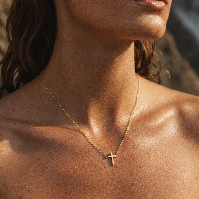 Faith to subtelny naszyjnik z minimalistycznym krzyżem o prostej, czystej formie. Niewielka zawieszka tworzy spokojny, symboliczny akcent i dobrze układa się blisko obojczyków. Smukły łańcuszek podkreśla lekkość projektu i nadaje całości elegancki charakter.