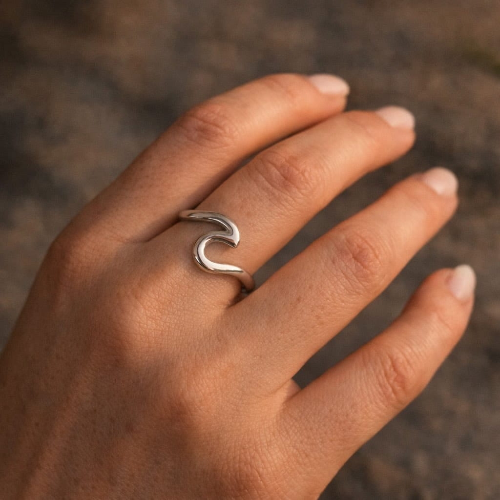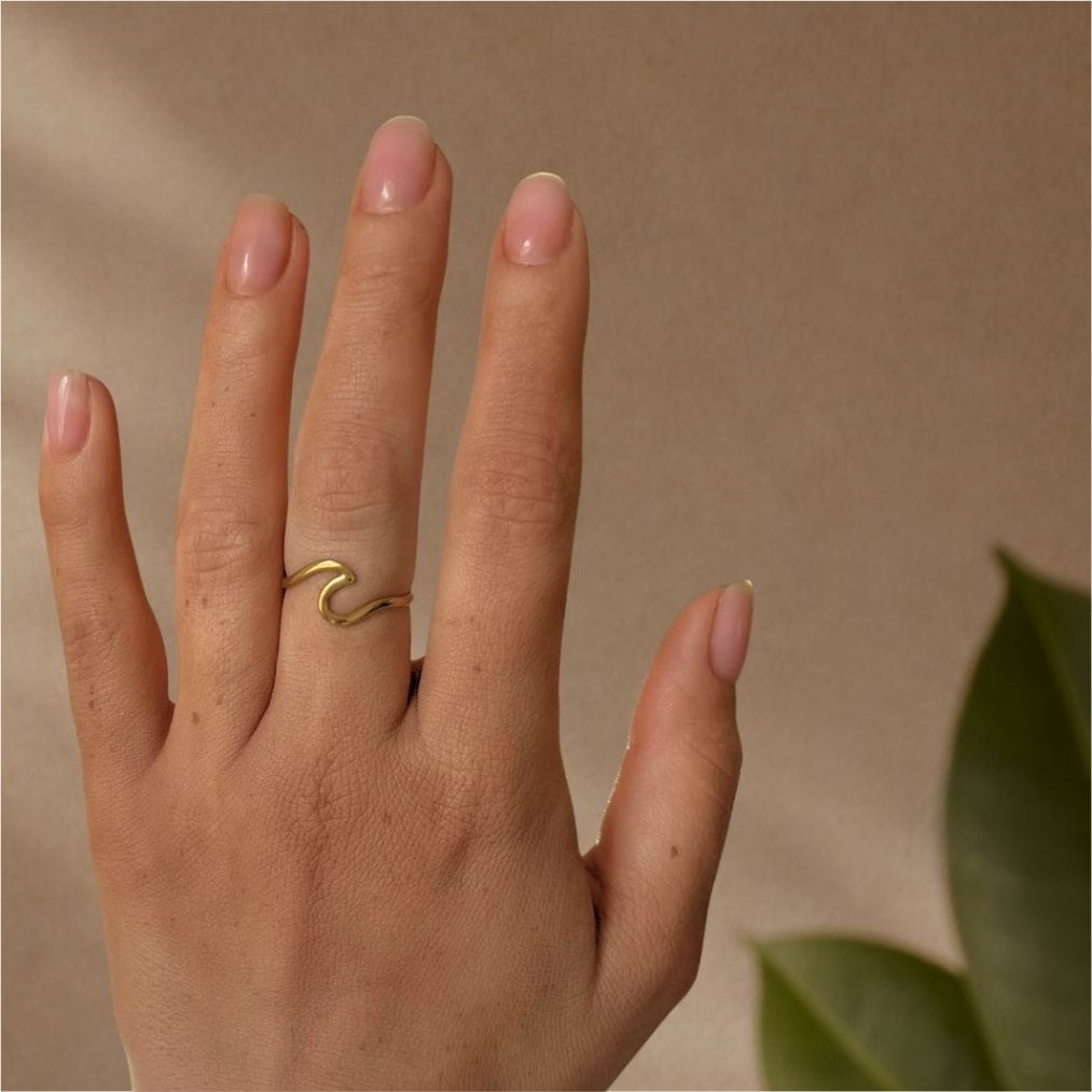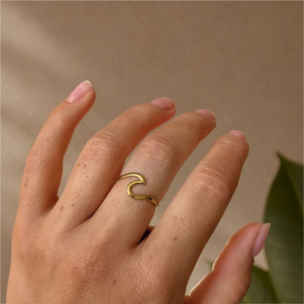 Pierścionek Wave to hołd dla piękna oceanu. Złoty lub srebrny pierścionek ze stali szlachetnej z subtelnym motywem fali, który przywodzi na myśl morskie krajobrazy..