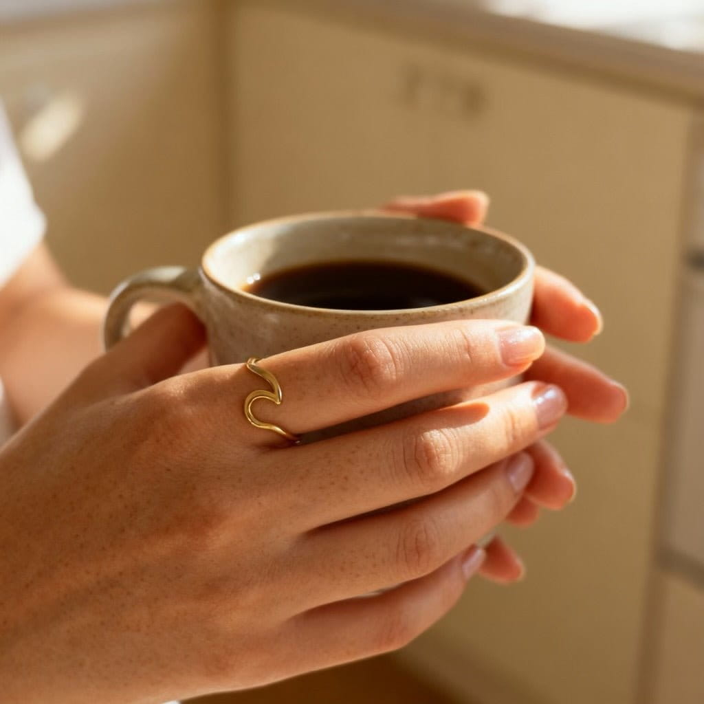 Pierścionek Wave to hołd dla piękna oceanu. Złoty lub srebrny pierścionek ze stali szlachetnej z subtelnym motywem fali, który przywodzi na myśl morskie krajobrazy..