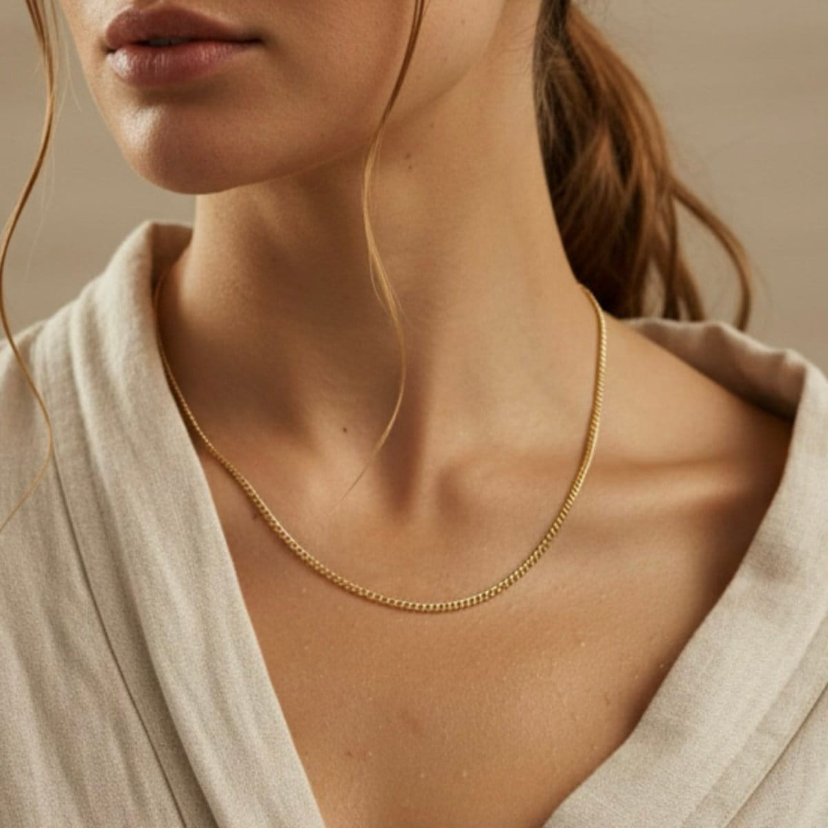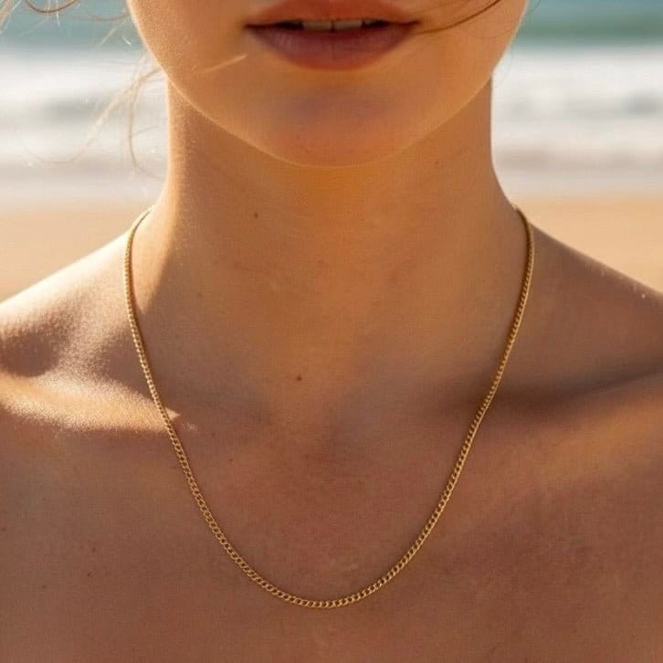 Dobrze wygląda solo, ale sprawdza się też jako warstwa pod krótszy naszyjnik lub baza pod zawieszkę. Gładka struktura subtelnie odbija światło i podkreśla opaleniznę oraz ciepły odcień skóry.