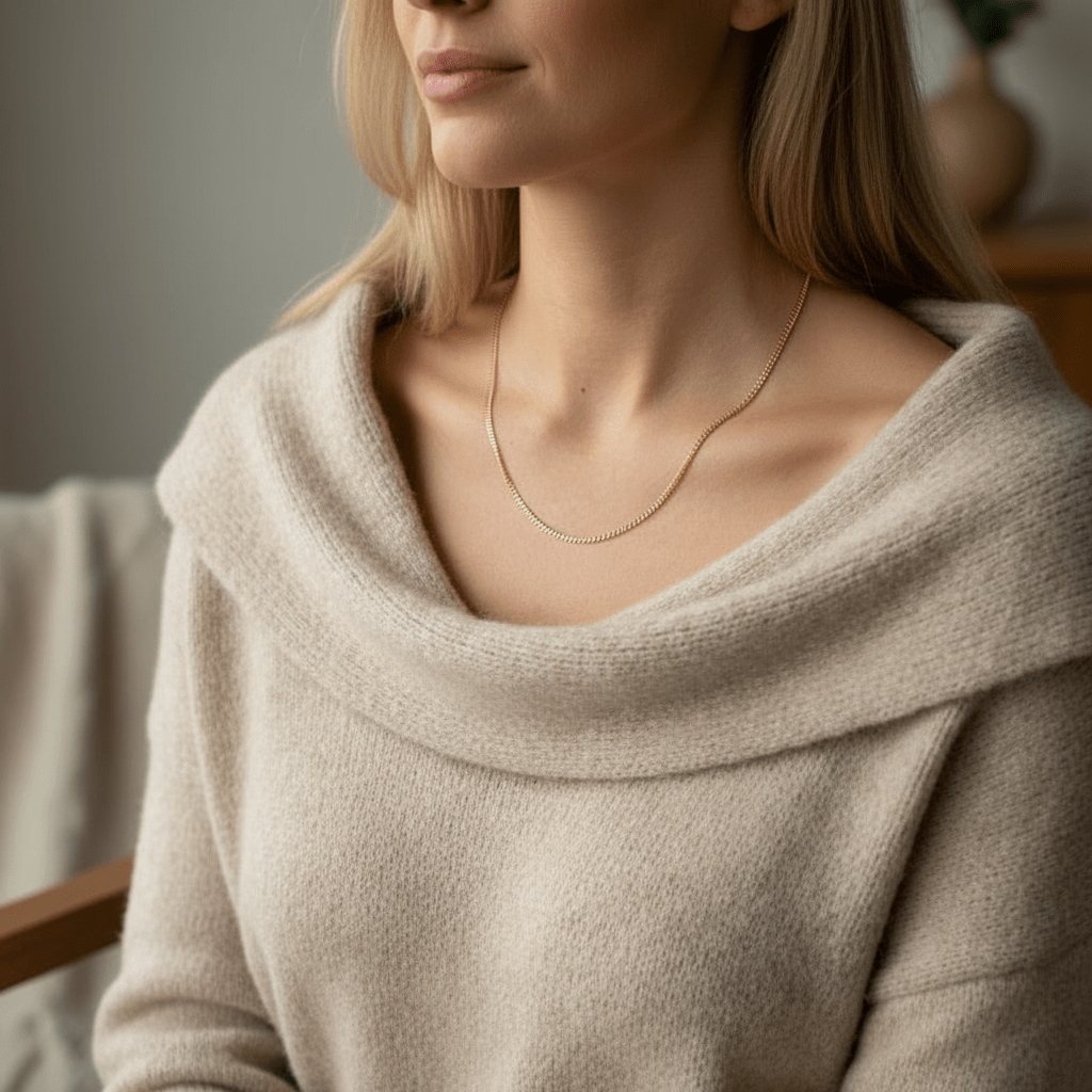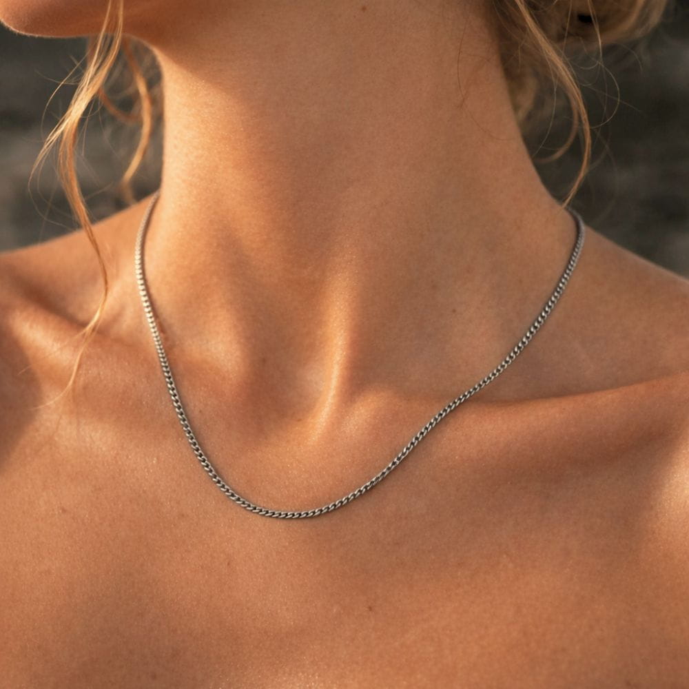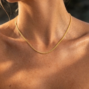 Link to minimalistyczna baza, która porządkuje stylizację jednym, czystym gestem. Cienki splot o szerokości 2 mm tworzy równą, spokojną linię wokół szyi. Nie przytłacza, ale jest wyraźnie obecny. To model, który możesz nosić codziennie, niezależnie od okazji.