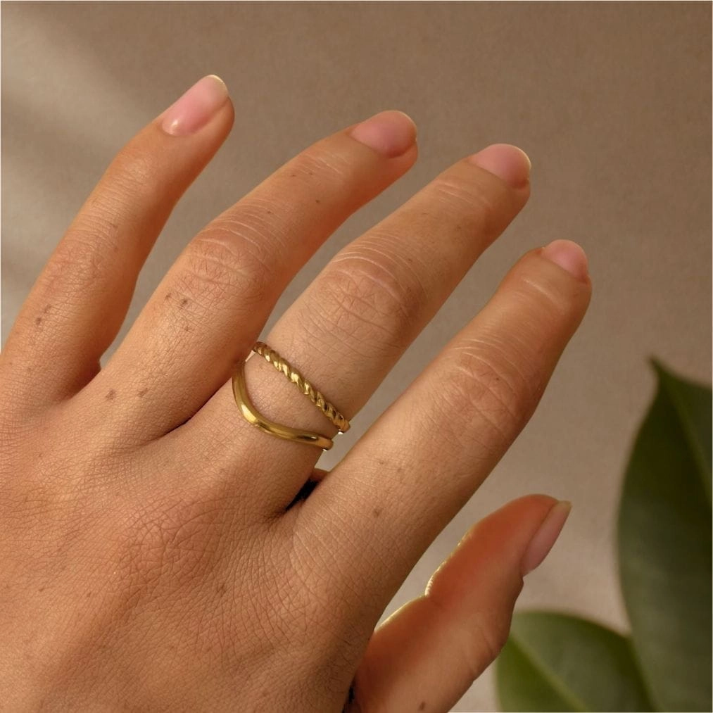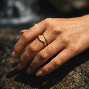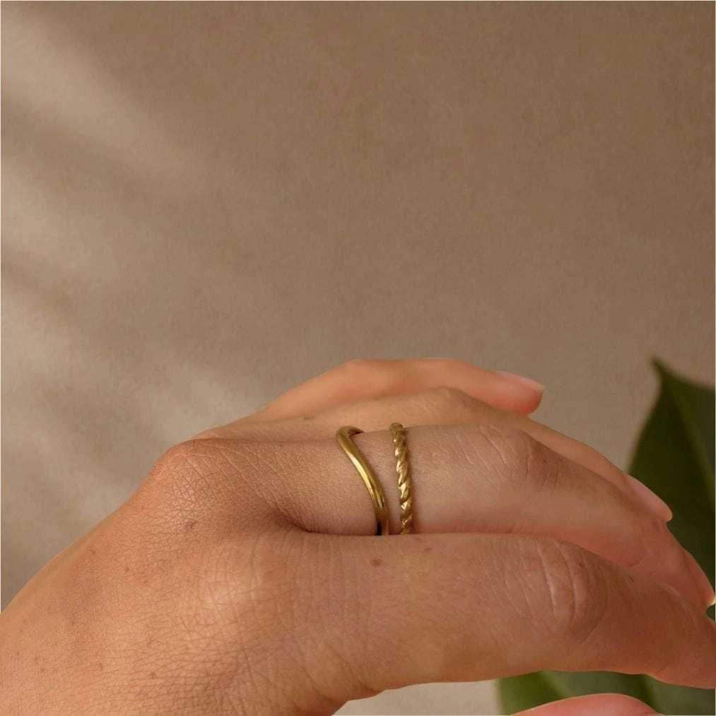 Naya to subtelna forma inspirowana miękkim ruchem. Dwie cienkie linie układają się w lekką falę, tworząc minimalistyczny, elegancki akcent. Jedna obrączka ma gładkie wykończenie, druga delikatną, skręcaną strukturę, która subtelnie odbija światło.