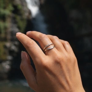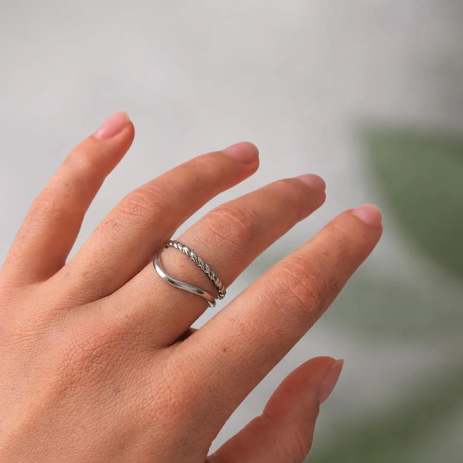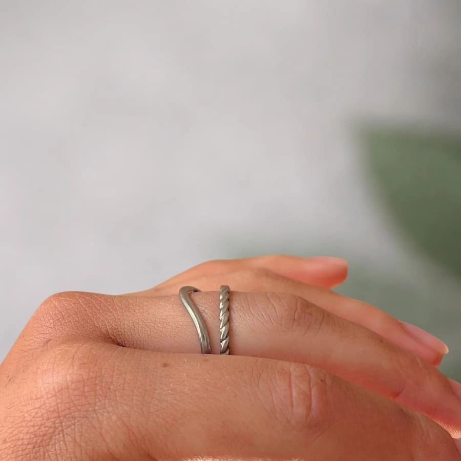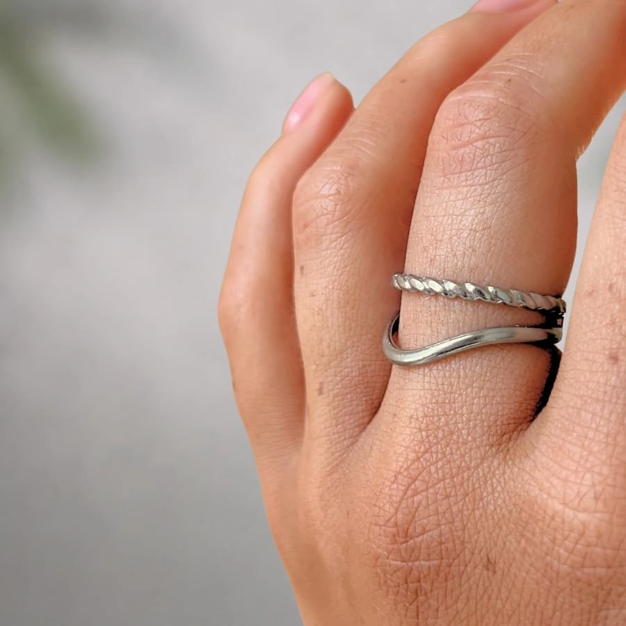Naya to subtelna forma inspirowana miękkim ruchem. Dwie cienkie linie układają się w lekką falę, tworząc minimalistyczny, elegancki akcent. Jedna obrączka ma gładkie wykończenie, druga delikatną, skręcaną strukturę, która subtelnie odbija światło.