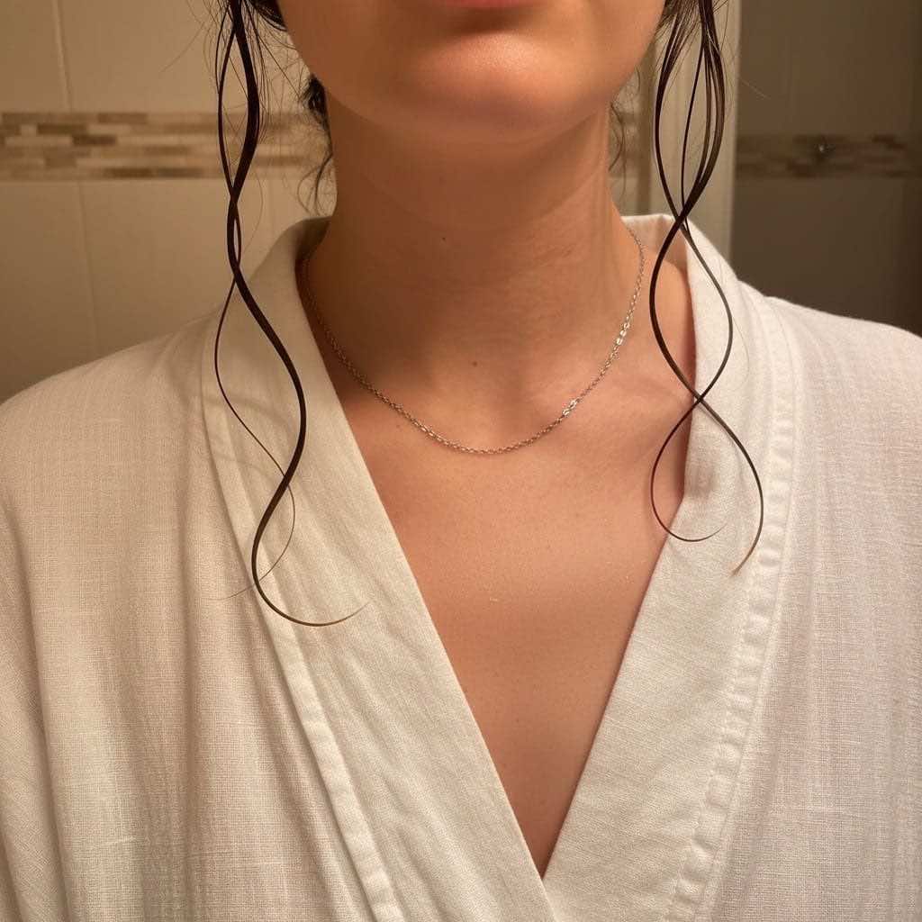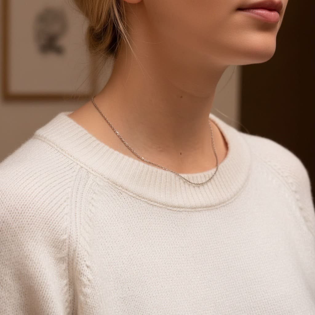 Jego delikatny połysk pięknie podkreśla linię szyi, a klasyczny splot sprawia, że pasuje dosłownie do wszystkiego – od sportowych stylizacji po elegancką sukienkę.