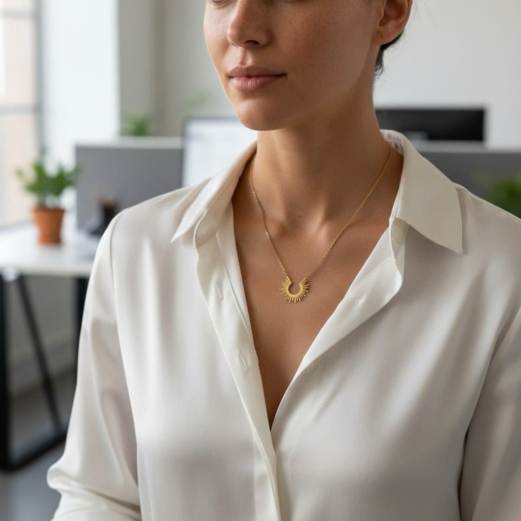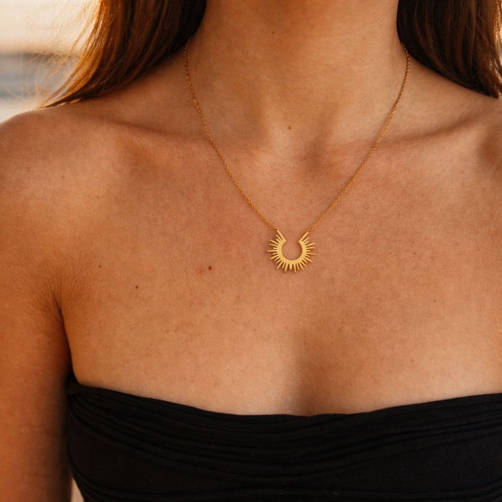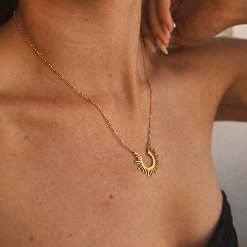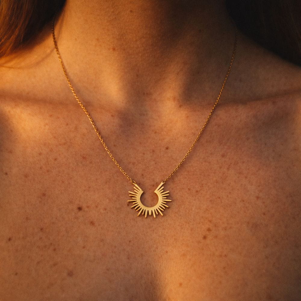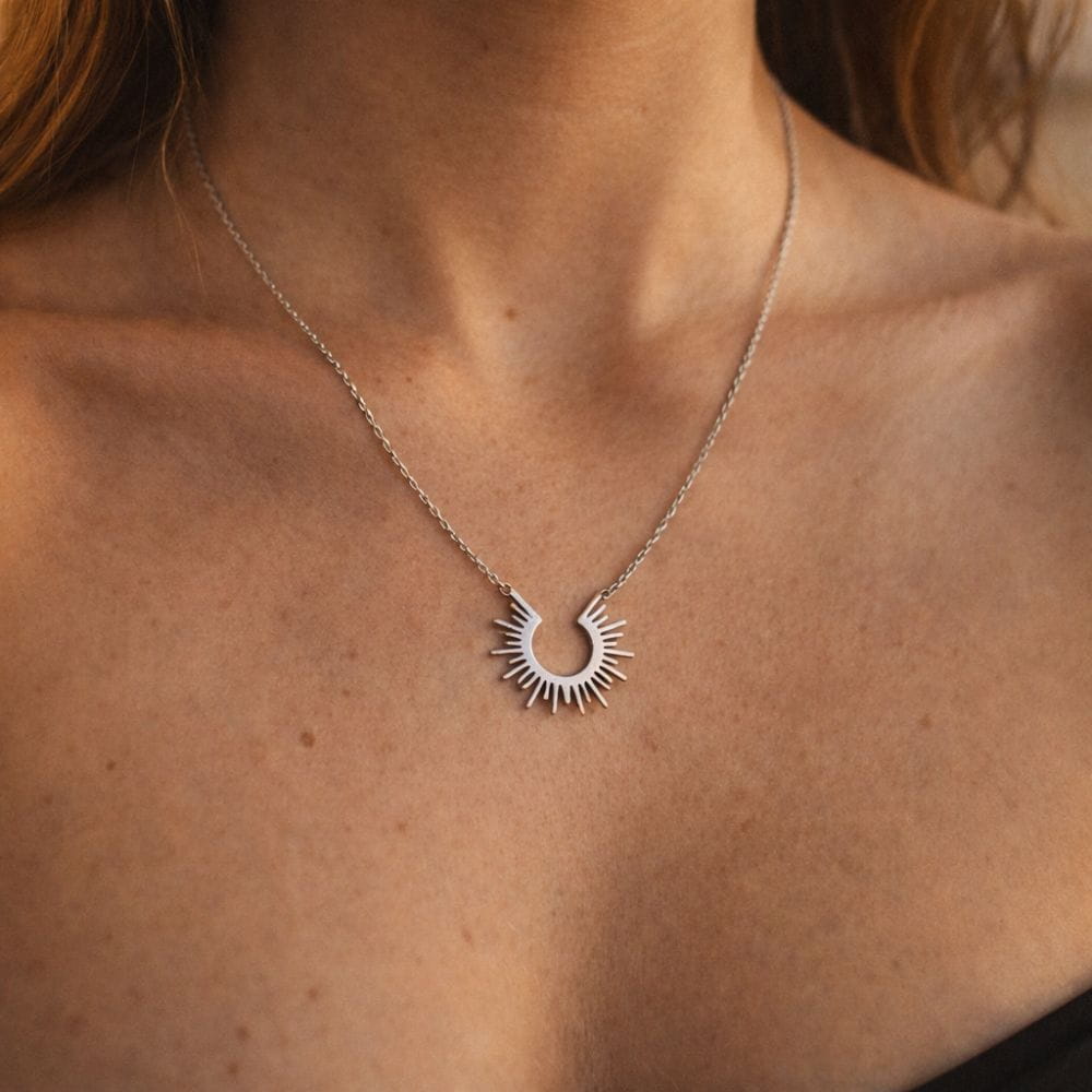 Soleya to symbol światła zamknięty w prostej, nowoczesnej formie. Otwarty motyw słońca z promieniami tworzy wyraźny, ale lekki akcent przy szyi. To biżuteria, która przyciąga spojrzenie, nie tracąc subtelności.