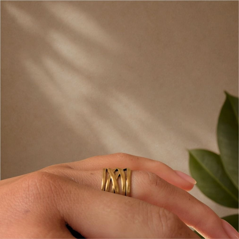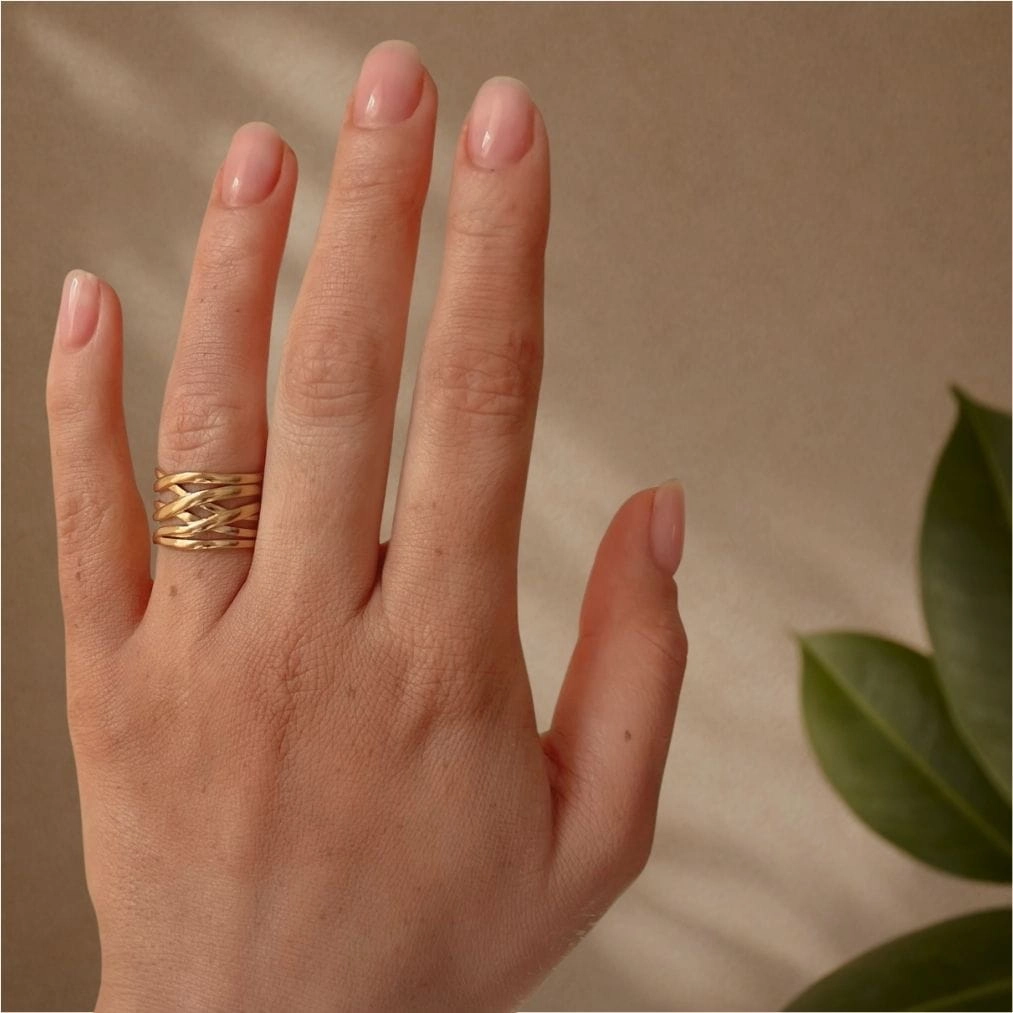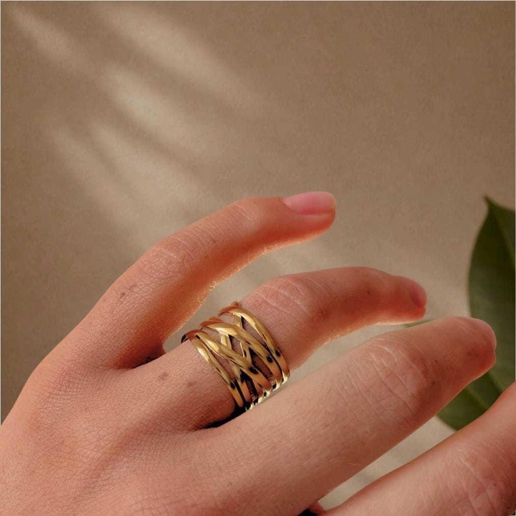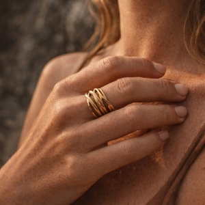 Twist Band to wyrazisty pierścionek o szerokiej, przestrzennej konstrukcji złożonej z przeplatających się, falujących pasm. Dynamiczna forma tworzy efekt ruchu i odbija światło w różnych kierunkach, dzięki czemu pierścionek przyciąga uwagę mimo minimalistycznego charakteru.