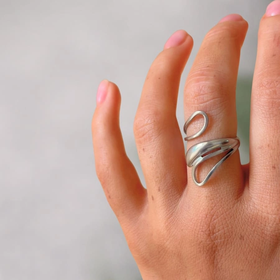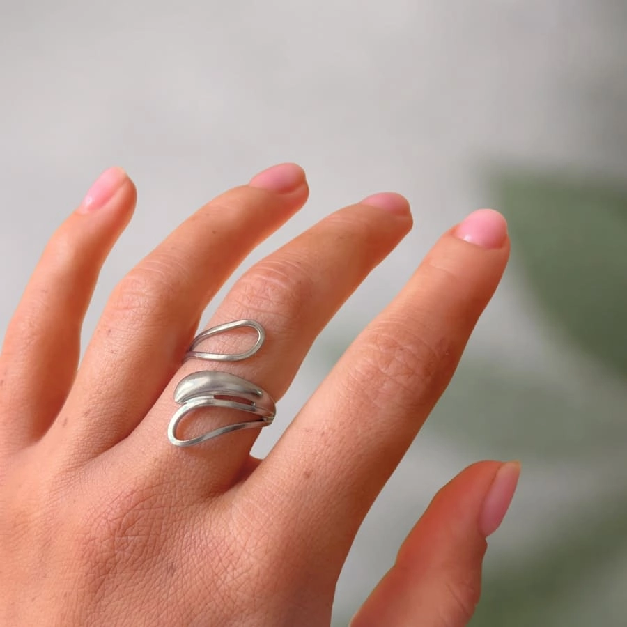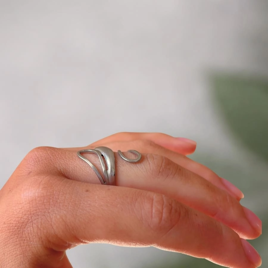 Otwarta konstrukcja pozwala na dopasowanie rozmiaru. Pierścionek można delikatnie regulować, aby lepiej układał się na palcu i pozostawał stabilny podczas noszenia.