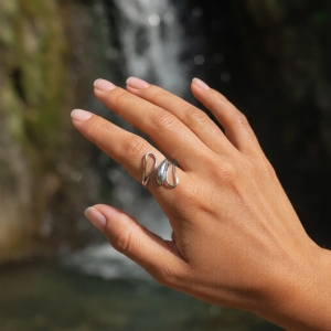 Vela przyciąga miękką, rzeźbiarską formą inspirowaną ruchem i naturalną linią. Otwarta obrączka układa się wokół palca w lekkiej, falującej kompozycji. Dwa smukłe elementy przeplatają się z gładkim, zaokrąglonym akcentem, tworząc subtelną, ale wyrazistą całość.