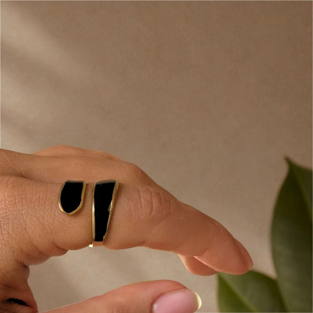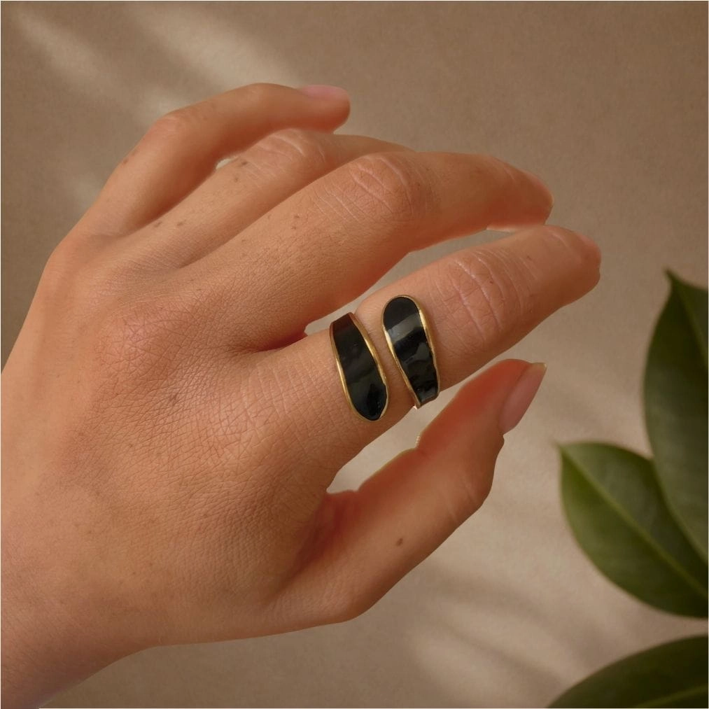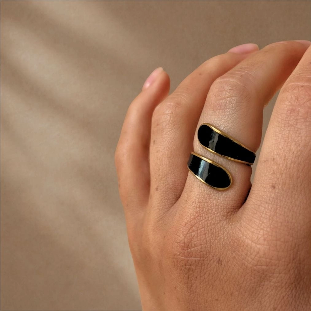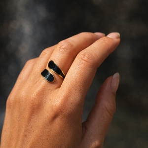 Dwa owalne akcenty mają gładką powierzchnię, która subtelnie odbija światło. W wersji czarnej pierścionek nabiera kontrastu i nowoczesnego charakteru. W wariancie z białą masą perłową wygląda bardziej miękko i świetliście. Obie opcje dobrze komponują się z innymi cienkimi pierścionkami, ale równie dobrze prezentują się solo.